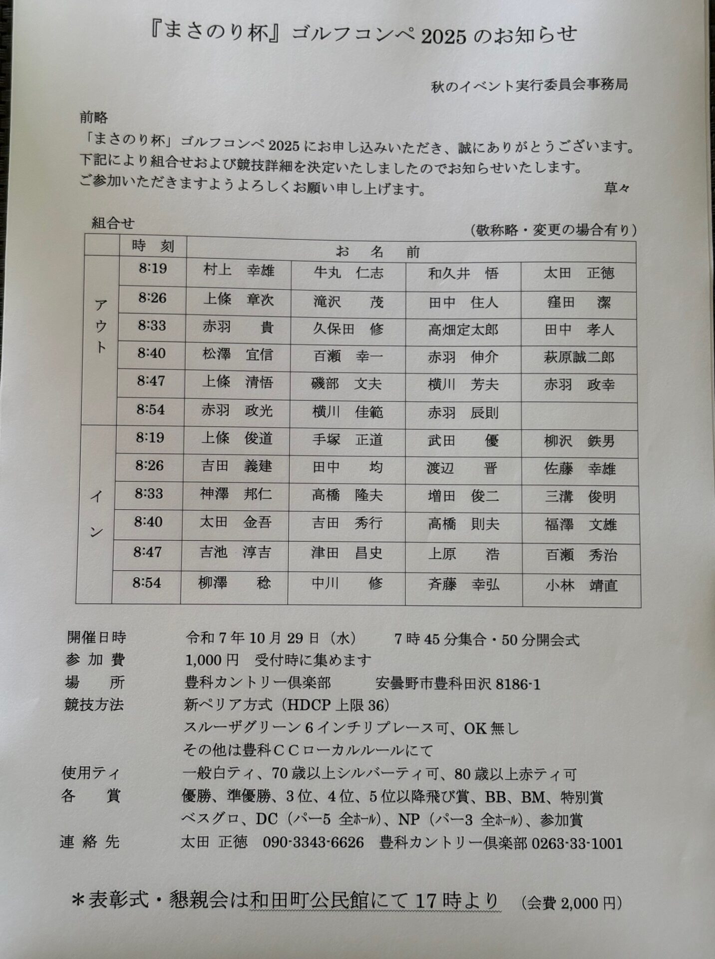 秋の懇親行事として「まさのり杯」ゴルフコンペ2025を、10月29日に豊科カントリー倶楽部で行います。47名の参加をいただき、別紙のとおり行いたいと思います。同日にボウリング大会も18名の参加で行われます。皆さんのご健闘をお祈りします。